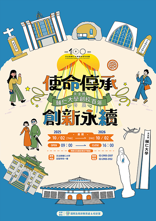 為慶祝天主教輔仁大學創校百年,「使命傳承‧創新永續:天主教輔仁大學創校百年特展」於2025.10.2在宜聖學苑「輔仁之友中心」盛大開幕,象徵著天主教輔仁大學走過百年歷程的榮耀傳承與未來願景,也向歷屆校友長期以來的支持與奉獻表達誠摯感謝。