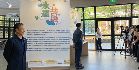 ▲「永續共融」展區:藍易振校長接受新聞傳播學系同學採訪,分享「恩典(G.R.A.C.E.)校務策略」