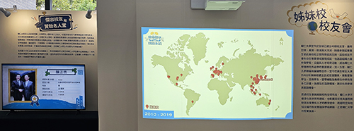 ▲左播放歷屆傑出校友照片,右以動畫投影展示全球姊妹校與校友會的分布地圖